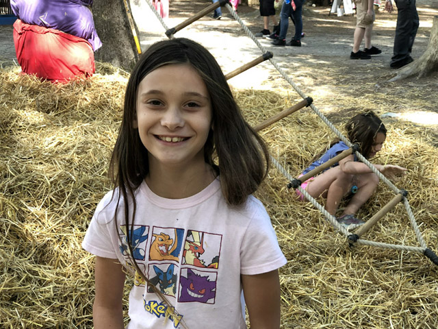 Cece riding a unicorn at King Richard's Faire
