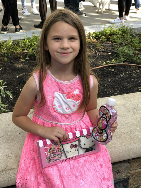 Angelina and Cece waiting in line at the Hello Kitty Food Truck in Somerville