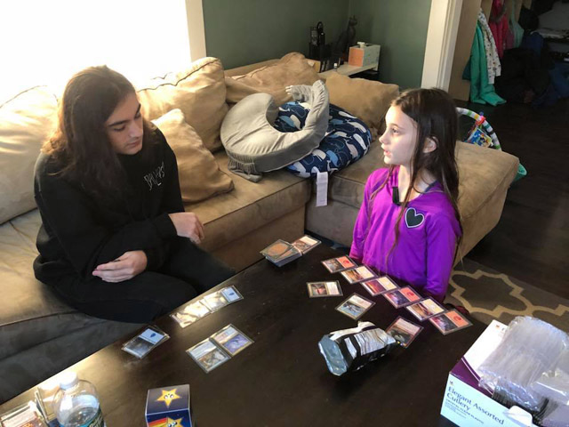 Dominic and Angelina playing a game of Magic while waiting for Thanksgiving Dinner